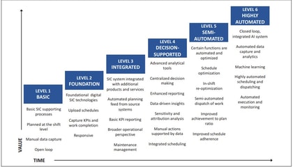 Systems with this capability are also classed as level six ‘highly automated’ under the GMG’s maturity model for short interval control (SIC) systems (see figure 1). These technologies enable a centralized coordinator to optimize equipment and activities against functions like maintenance, mine planning, and logistics, providing improvements in accuracy, effectiveness, and speed of operation-wide activity coordination.