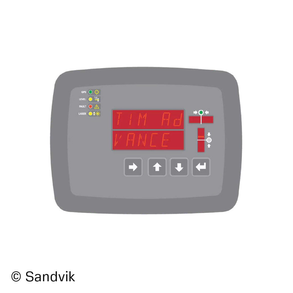 •TIM 6500 - Some applications require a smooth floor or a certain inclination even when the job site surface is uneven. With a laser level based TIM 6500 the operator can meet these requirements easily. The sensor is protected to IP65 class and reading area is full 360 degrees. The detection distance is 150 meters with 1 mW laser beacon. The laser beacon* has to transmit rotating visible red and the wavelength 630-680 nm. TIM 6500 has a laser receiver on the side of the rock drill. The operator presets the required hole depth on TIM display based on a laser level. The system indicates when the rock drill first time passes the laser level and starts counting the preset hole depth. The operator gets a signal and the drilling stops when the desired hole depth is reached. Other features of TIM6500 are like in TIM6300 without GPS compass. -