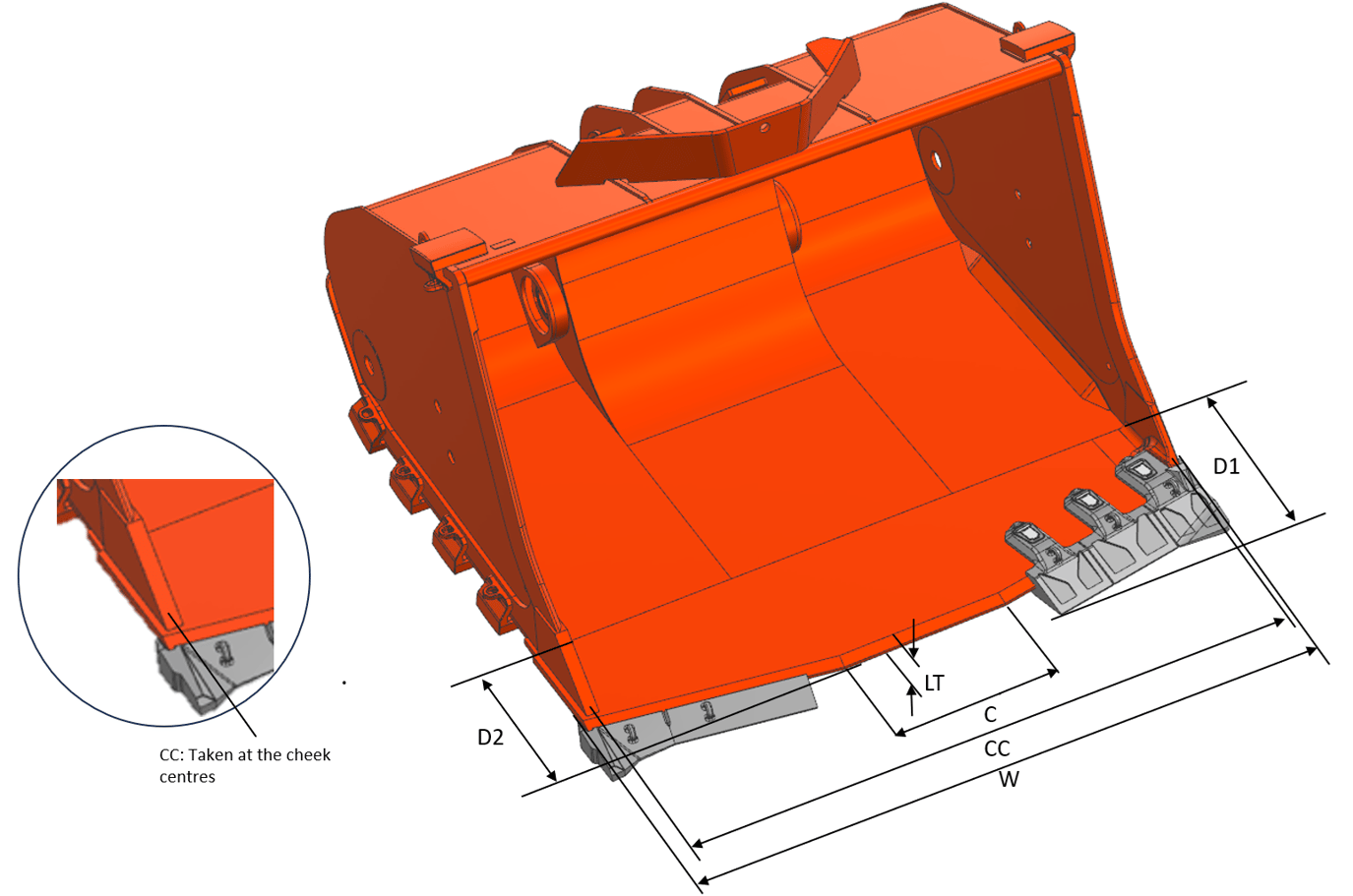 2.Mitta "CC" ilmaisee kauhan leveyden poskilevyjen keskipisteiden välillä