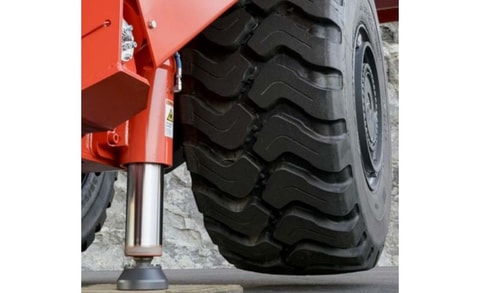Le système se compose de quatre cylindres hydrauliques montés sur les châssis avant et arrière. Ces vérins hydrauliques sont destinés à soulever le camion pour le remplacement du pneu. Chaque vérin est commandé séparément par une Radiocommande qui est reliée à l'extérieur de la cabine par un câble.Le système de levage intégré de Sandvik est capable de lever le camion en tout lieu (avec un niveau du sol ferme) et en toute circonstance, même dans des espaces confinés ou si le camion est entièrement chargé.