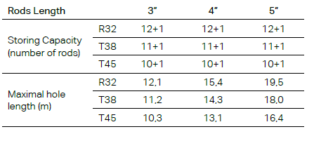 Le changeur de barres est conçu pour les allonges MF R32, T38 ou T45. Lors du changement du diamètre de barres, les plaques d'index et les pièces d'usure des mâchoires de serrage doivent être changées (kit de modification et de mise à niveau disponible).