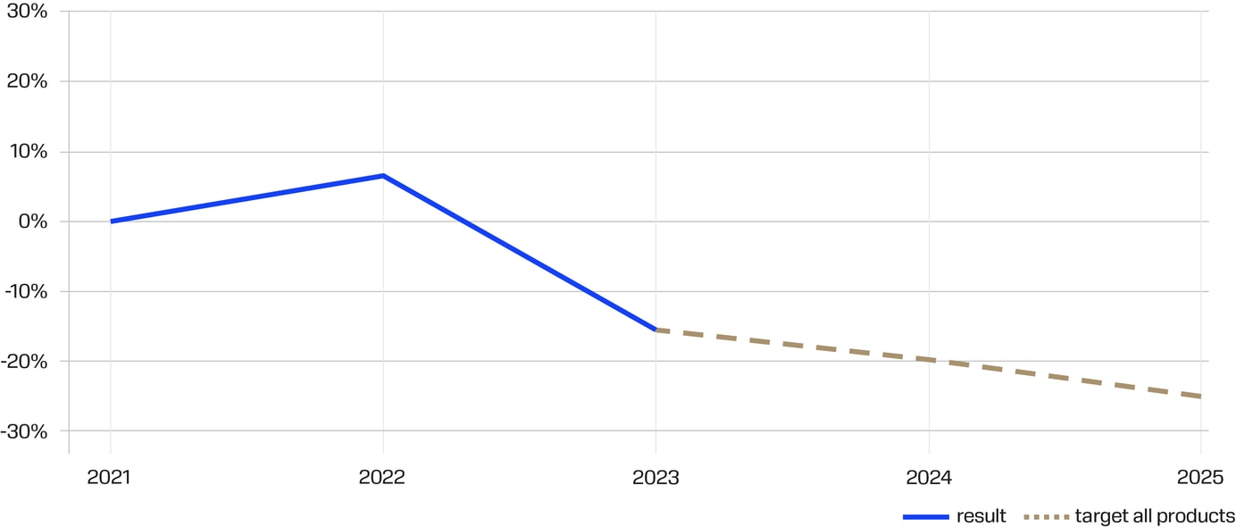 Utsläppen i föregående led av växthusgaser från stålet som används i Sandvik Rock Tools minskade med 15 % jämfört med vårt basår 2019, och även om vi ser en inverkan från volymen är det ett klart framsteg i växthusgasutsläpp per inköpt ton stål år för år.