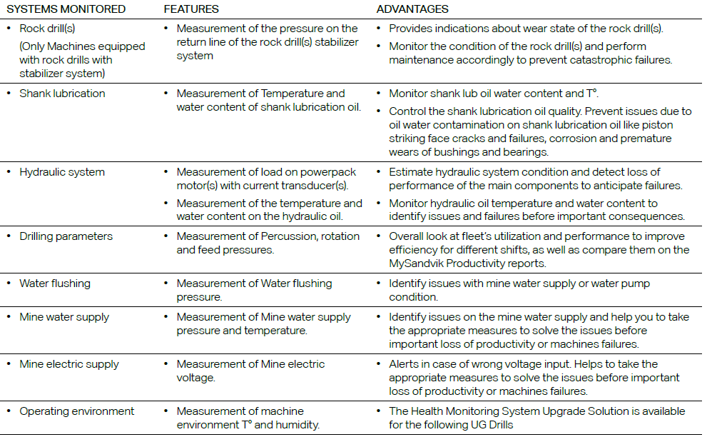 Data som uppmäts av statusövervakningssystemet överförs till My Sandvik Digital Services Knowledge Box™. Dessa data används för att skapa My Sandvik Productivity-rapporter som ger en direkt överblick över flottans skick, utnyttjande och prestanda. Systemet kan också användas för att ta fram larm- och signalrapporter för att upptäcka tidiga säkerhetsöverträdelser eller problem med låg prestanda.