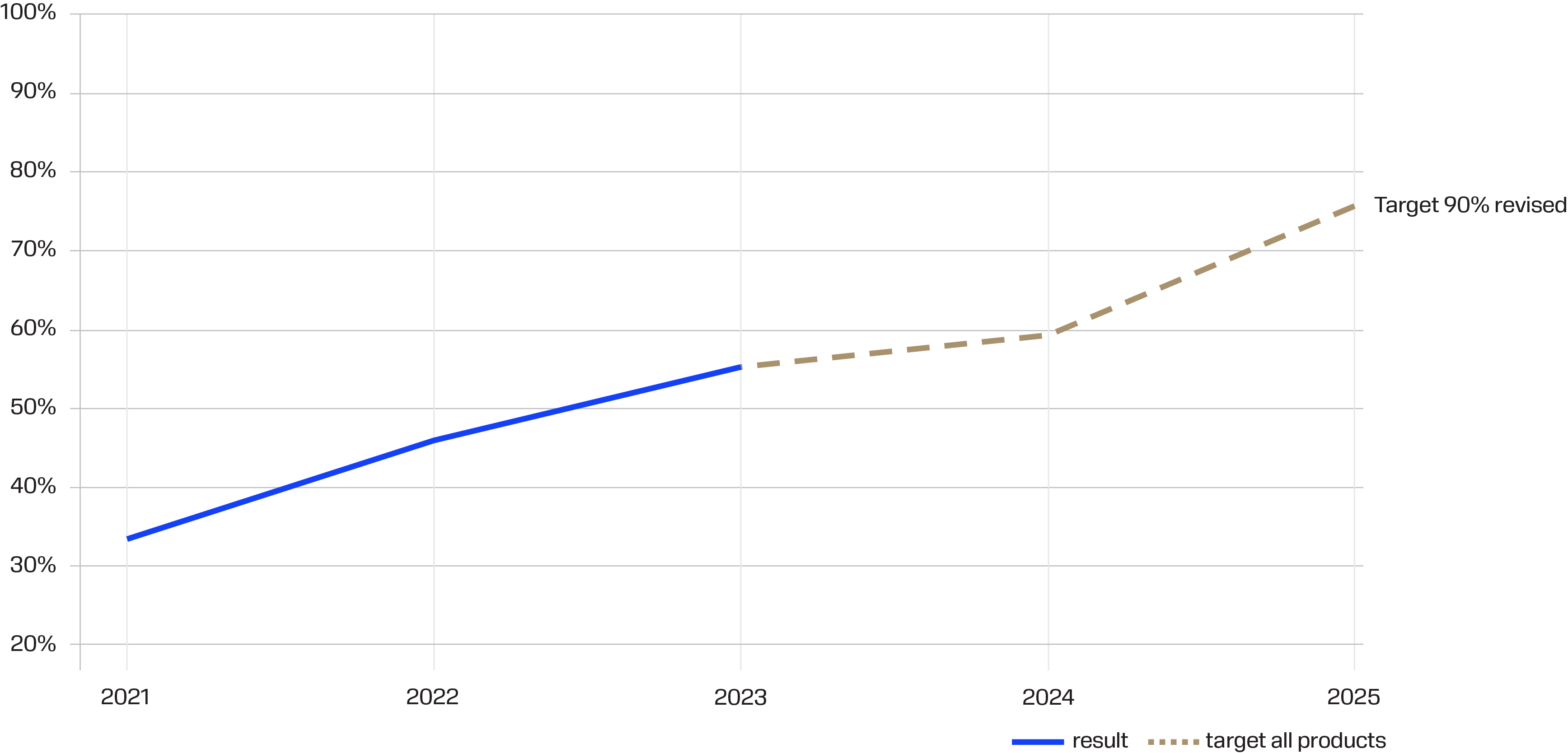 到 2024 年,我们保持 95% 的目标。 重点将放在建立这种高水平的循环性上,并进一步专注于最大限度地减少浪费和提高当前回收流的效率。